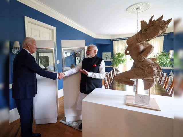 அப்போது, இந்தியாவில் இருந்து கடத்தப்பட்ட 297 பழங்கால கலைப் பொருள்களை அதிபர் ஜோ பைடன் பிரதமர் மோடியிடம் ஒப்படைத்தார். இந்த விலைமதிப்பற்ற கலைப் பொருள்களை திருப்பிக் கொடுத்ததற்காக அதிபர் ஜோ பைடனுக்கு பிரதமர் மோடி நன்றி தெரிவித்துக் கொண்டார்.