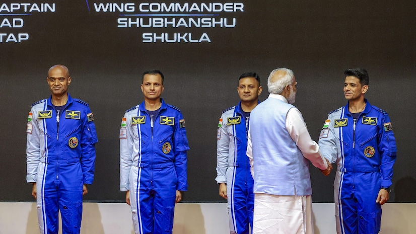 அப்போது, மனிதர்களை விண்வெளிக்கு அனுப்பும் ககன்யான் திட்டத்தின் மூலம் விண்வெளி செல்லும் 4 வீரர்களை பிரதமர் மோடி அறிமுகப்படுத்தினார். ககன்யான் திட்டத்தில் குரூப் கேப்டன்கள் பிரசாந்த் பாலகிருஷ்ணன் நாயர், அங்கத் பிரதாப், அஜித் கிருஷ்ணன் மற்றும் விங் கமாண்டர் சுபான்ஷூ சுக்லா ஆகியோரை அறிமுகம் செய்து வைத்தார். அவர்களுக்கு பதக்கம் அணிவித்து வாழ்த்தும் தெரிவித்தார்.