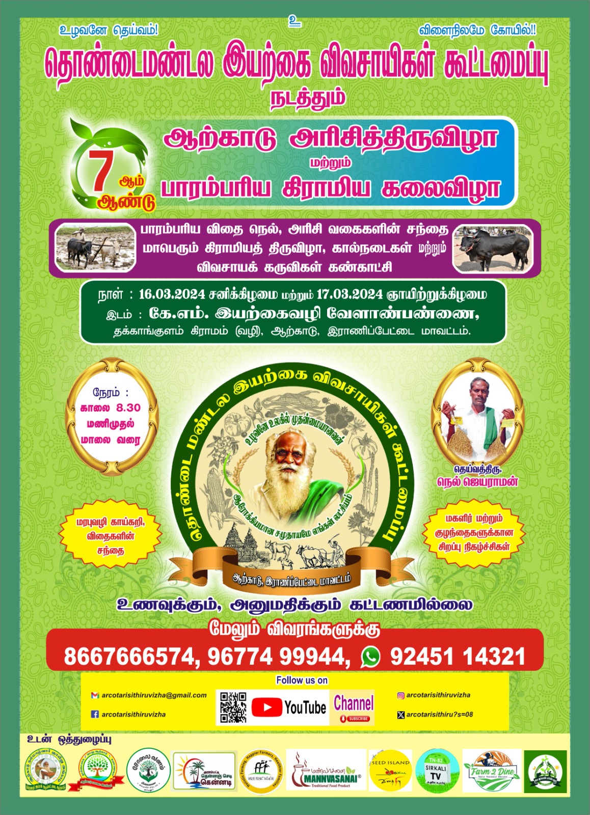 உழவனே உலகில் முதன்மையானவன், ஆரோக்கியமான சமுதாயமே எங்கள் லட்சியம் என்ற கோட்பாட்டுடன் தென்மண்டல இயற்கை விவசாயிகள் கூட்டமைப்பு நடத்தும் பாரம்பரிய அரிசித் திருவிழா மற்றும் பாரம்பரிய கிராமிய கலைவிழா இந்தாண்டு மார்ச் 16, 17 ஆம் தேதிகளில் இராணிப்பேட்டை மாவட்டம் ஆற்காடு நகரில் நடைபெறவுள்ளது. பாரம்பரிய நெல் வகைகள், அரிசி வகைகள் பாதுகாப்பதுடன், அவைகள் மீட்டெடுக்கும் முயற்சியாக இத்திருவிழா முன்னெடுக்கப்பட்டுள்ளது. இத்திருவிழாவில் பாரம்பரிய நெல், அரிசி வகைகளை காட்சிப்படுத்துதல் மற்றும் கிராமிய கலைவிழாவிற்கும் ஏற்பாடு செய்யப்பட்டுள்ளது. அதுபோக கால்நடைகள் மற்றும் விவசாய கருவிகள் கண்காட்சிக்கும் ஏற்பாடு செய்யப்பட்டுள்ளது. இந்த மாபெரும் விவசாய திருவிழா ஆற்காடு நகரில் கே.எம் இயற்கை வேளாண்பண்ணை எனும் இடத்தில் நடைபெறவுள்ளது.
