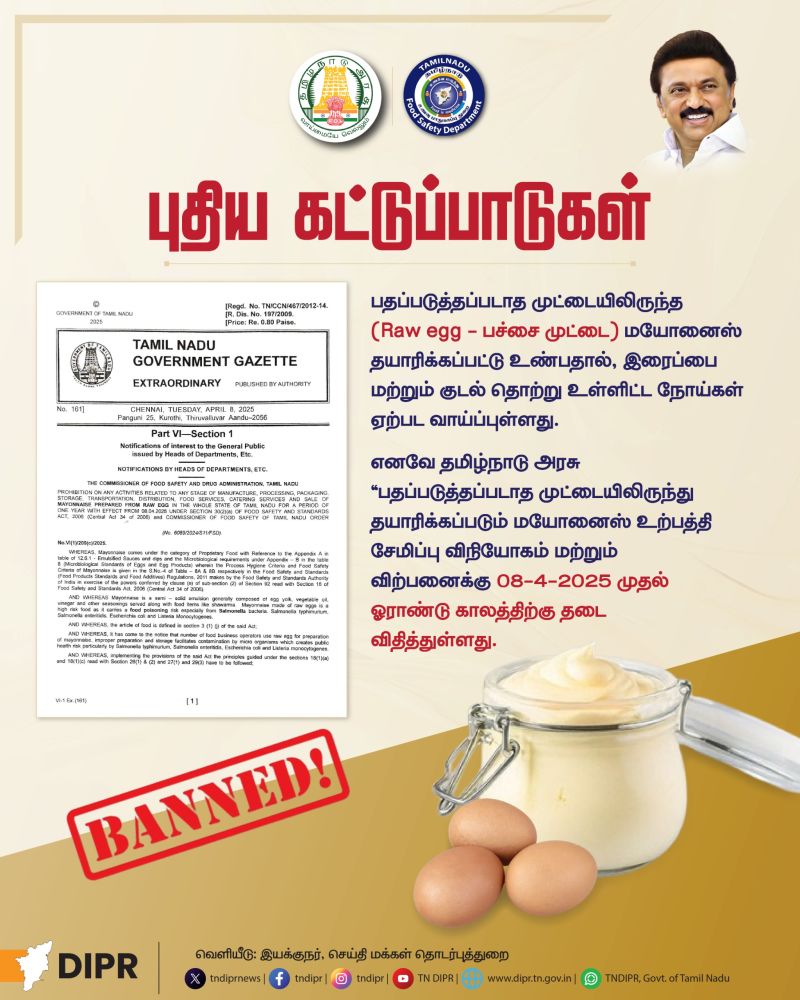 - உணவகங்களில் உணவு பரிமாற வாழை இலை அல்லது அனுமதிக்கப்பட்ட பார்ச்மென்ட் பேப்பர் அலுமினியம் பாயில் மட்டுமே பயன்படுத்த வேண்டும்.